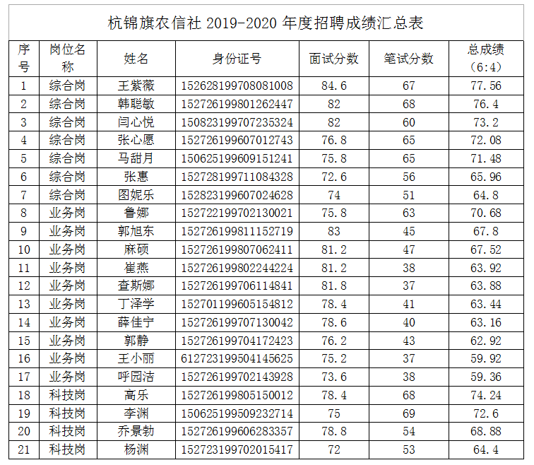 根據(jù)《內(nèi)蒙古農(nóng)村信用社2019-2020年度全區(qū)法人機(jī)構(gòu)應(yīng)屆高校畢業(yè)生校園招聘簡(jiǎn)章》要求,杭錦旗農(nóng)村信用合作聯(lián)社2019—2020年度校園招聘面試筆試全部結(jié)束,現(xiàn)將成績(jī)公告如下: