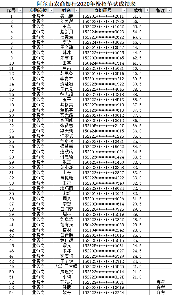 阿爾山農(nóng)商銀行關(guān)于2020年度校園招聘筆試成績的公告