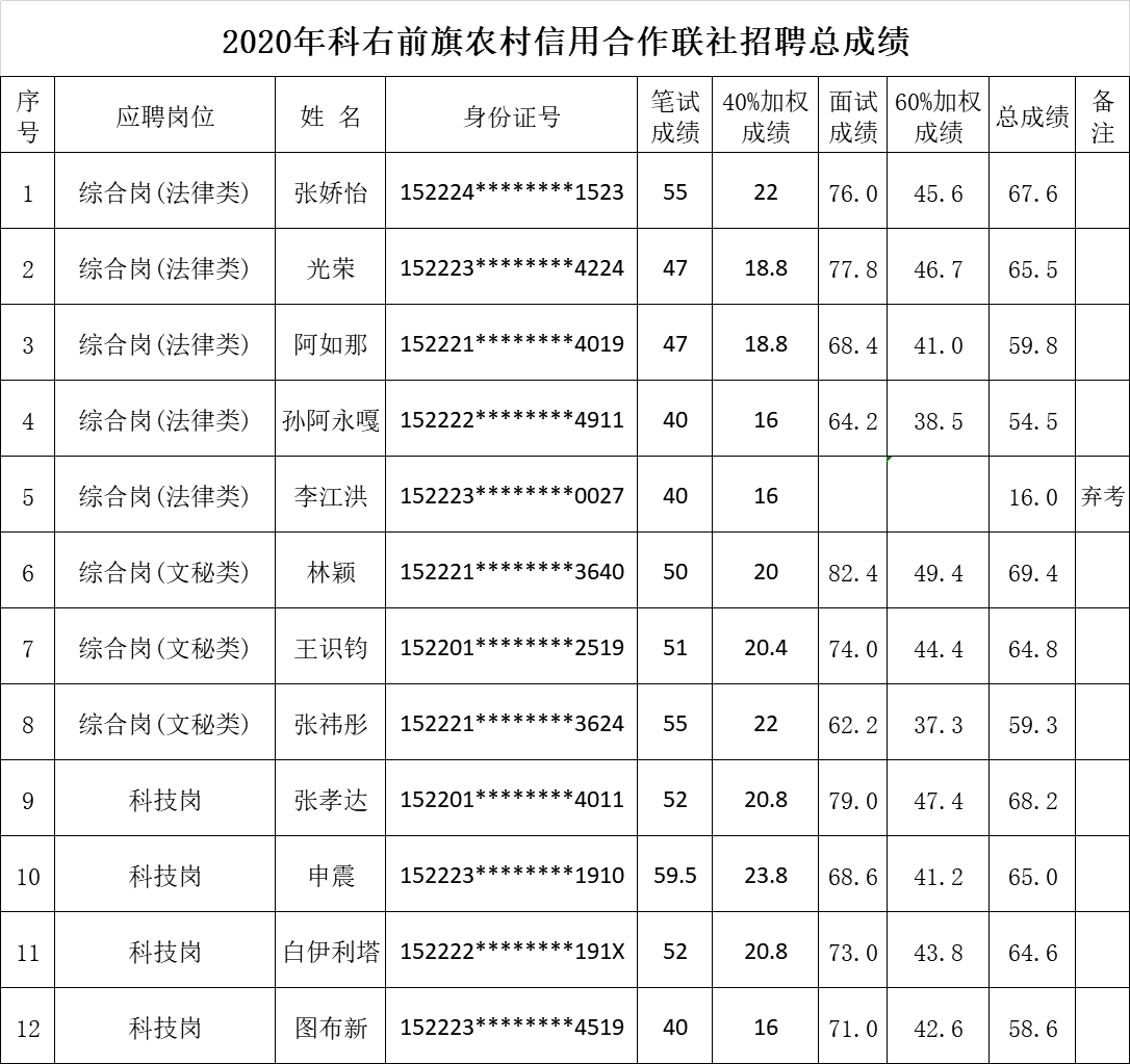 根據(jù)《內(nèi)蒙古自治區(qū)農(nóng)村信用社聯(lián)合社2020年轄內(nèi)法人機構應屆高校畢業(yè)生校園招聘工作的通知》要求,2020年8月14日—8月16日開展了資格審查和筆試,共有23人參加筆試,根據(jù)相關專業(yè)筆試成績由高到低,12人進入面試(其中1人自愿放棄面試)。2020年8月17日,科爾沁右翼前旗農(nóng)村信用合作聯(lián)社圓滿完成了2020年度校園招聘面試工作?,F(xiàn)將面試人員按筆試與面試4:6比例加權計算總成績予以公布。