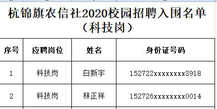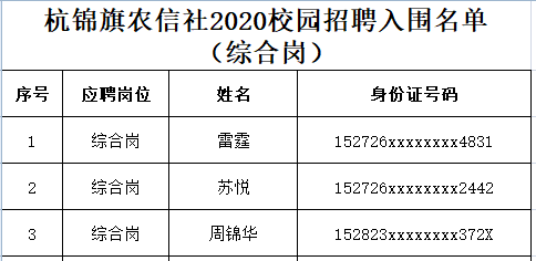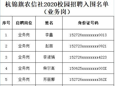 杭錦旗農(nóng)村信用合作聯(lián)社2020年度校園招聘入圍人員名單的公示